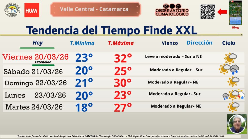 En sectores serranos del centro provincial, las temperaturas serán más moderadas, con registros cercanos a 19 °C / 25 °C, mientras que en la Puna, Antofagasta de la Sierra presentará condiciones más frescas con 6 °C de mínima y 21 °C de máxima.