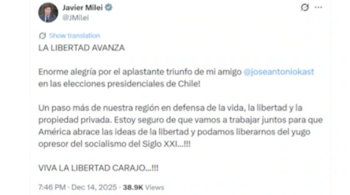 A través de sus redes sociales, Milei celebró el triunfo del líder del Partido Republicano, al que calificó como su amigo y figura afín ideológicamente. El mandatario argentino destacó la victoria de Kast y utilizó el lema “La Libertad Avanza”, vinculándolo al resultado del balotaje y al avance de una agenda política compartida entre ambos líderes.